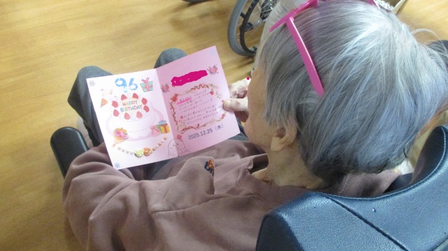 今日はご入居者様のお誕生日です(^^♪96歳になられました‼フロアの皆様とスタッフで盛大にお祝いさせていただきました🎊バースデーカードをお渡しすると、うんうんと頷かれ、じっくりと読んでくださいました(*^-^*)カメラを向けるとポーズをとってくださり素敵な写真が撮れました(⋈◍>◡<◍)。✧♡ケーキもしっかりと召し上がられました‼おめでとうございます🎊これからもますますお元気でいてください(^^)/