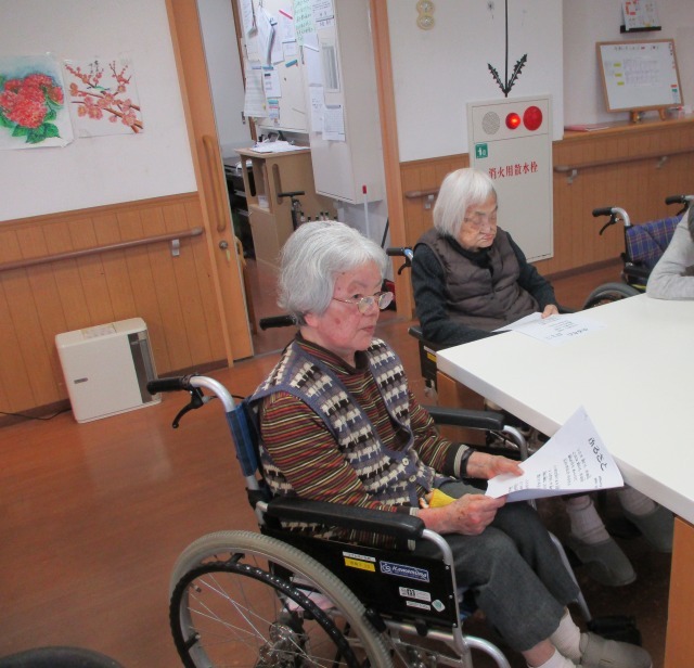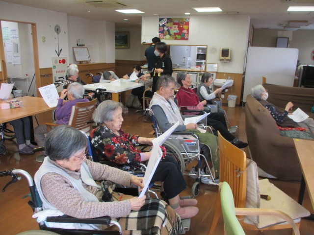 月に一度の音楽療法の日♬今回もたくさんのご利用者様が参加してくださいました(*^-^*)今日は【蛍の光】【早春賦】など今の季節にぴったりな曲を歌いました🎤今日も元気できれいな歌声がフロアに響いていましたよ(^^♪