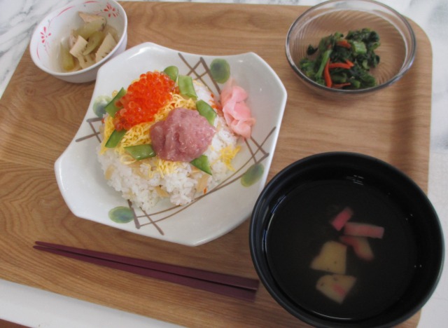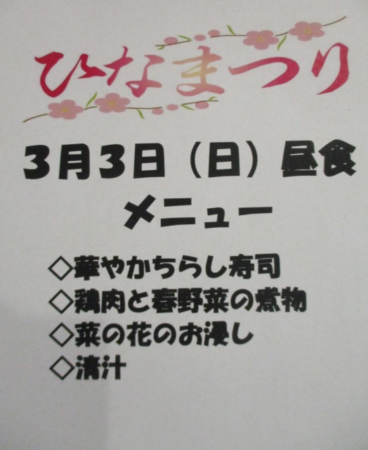 今日はひな祭り🌸🎎空は気持ちよく晴れてとってもいいお天気になりましたね🌞お昼ごはんは【ひな祭りメニュー】でした(*^-^*)春らしい暖かさが伝わってくるようなお食事でした🌸ごちそうさまでしたm(__)m
