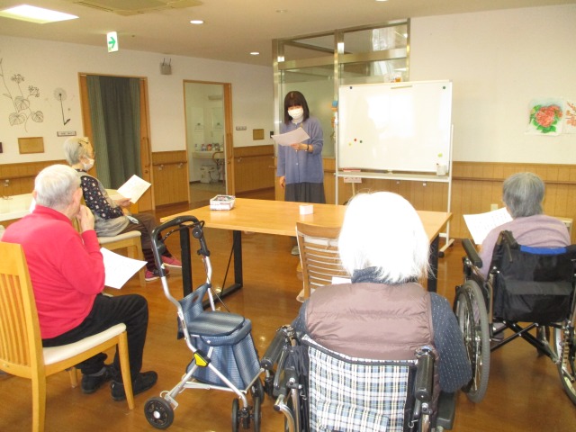 今日は月に一度のアクティビティ【朗読会】が行われました(*^-^*)準備体操⇒発声練習⇒詩の朗読と続き、皆様とてもいい声で朗読をされておりました(*^-^*)声を出すことは大事な事ですね‼