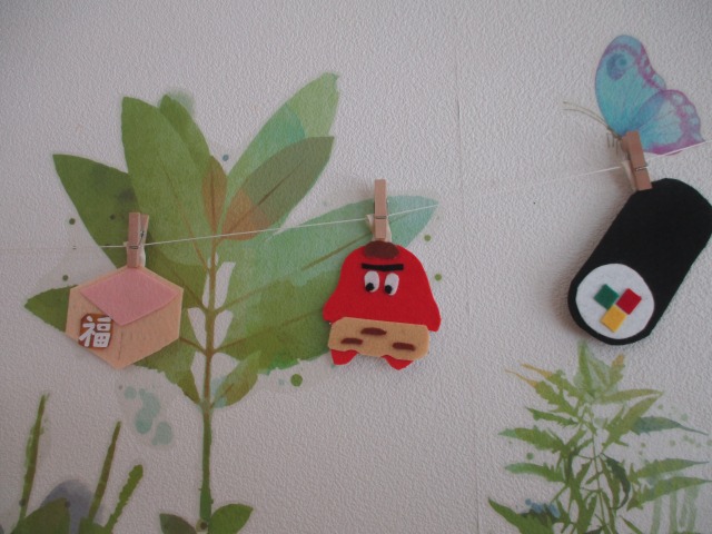 今日も【節分】グッズのご紹介‼節分の飾りが少ないなぁ…と思い、かわいいガーランドを手作りしました(*^-^*)フェルトのマスコットを作り、つなげました(⋈◍>◡<◍)。✧♡まあまあうまく出来たのでは…?と思います(`・∀・´)エッヘン!!