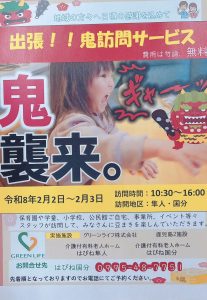 トップページ > 施設を探す > はぴね国分 関連 介護付有料老人ホーム はぴね国分 施設へのお電話は 0995-48-7751 9時00分~17時30分 (365日受付) 入居に関するお問い合わせ 0120-1165-14 施設の特徴 施設概要 料金プラン 施設のアルバム 123次へ » 2026年01月30日 ☆初詣☆ こんにちは。 霧島市国分中央にあります 介護付有料老人ホーム はぴね国分です。 おそくなりましたが 鹿児島神宮へ初詣に行ってきました。 『楽しく元気に過ごしています。 これからも見守ってて下さい』 と皆で手をあわせて、 おみくじを引いて帰ってきました。 2月は、鹿児島神宮の馬が踊る 初午祭があります。 ☆はぴね国分☆ 関連 2026年01月26日 ☆かごしま女子駅伝☆ こんにちは。 霧島市国分中央にあります 介護付有料老人ホーム はぴね国分です。 先日、かごしま女子駅伝の応援に行ってきました。 応援メッセージとメガホン持って 『頑張れー』と叫ぶ入居者様。 気持ちが高ぶり、前へ前へと歩き出します。 応援後も 『なんだか、逆に元気をもらった気分だね』 『寒い中、凄いわー』 と話しておりました。 ☆はぴね国分☆ 関連 2026年01月17日 ☆おに訪問☆ こんにちは。 霧島市国分中央にあります 介護付有料老人ホーム はぴね国分です。 今年もやってきます。節分の鬼!! 職員と入居者様が鬼になって訪問いたします。 只今、予約受付中です。 是非、皆様体験してみてください♡♡ お問合せお待ちしております。 ☆はぴね国分☆ 関連 2026年01月12日 ☆成人の日☆ こんにちは。 霧島市国分中央にあります 介護付有料老人ホーム はぴね国分です。 今日は☆成人の日☆ 先日、ご入居者様のもとへ ご家族様が来られました。 職員やご入居者様も見惚れてしまうほど綺麗でした♡ ☆はぴね国分☆ 関連 2026年01月01日 ☆ 正月遊び ☆ こんにちは。 霧島市国分中央にあります 介護付有料老人ホーム はぴね国分です。 2026年1月1日 皆さんで初日の出を拝み 朝からパイ投げや二人羽織をしました。 たくさん笑って、お昼は豪華なおせちとビール♡ 皆さんで乾杯し、はぴね神社へお参りです。 おみくじを手に、『なにが出た??』 と確認し合うご入居者様。 ☆はぴね国分☆ 関連 123次へ » 近隣施設のご紹介 はぴね隼人 介護付有料老人ホーム はぴね福岡野芥 介護付有料老人ホーム はぴね別府流川 介護付有料老人ホーム はぴね別府亀川 介護付有料老人ホーム