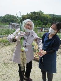 大きな玉ねぎを見つけられ「よっこらっしょ」、力いっぱい引っ張ります。