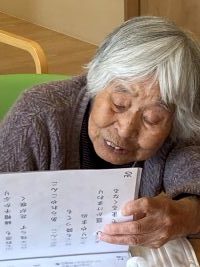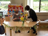 スタッフ手作りの色紙をプレゼントし、全員でお祝いのうたを歌いました。はぴね周南で一番長くお住まいになっておられる方です。