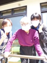 外気浴を致しました。歩行訓練中の男性陣をパチリ。
