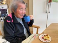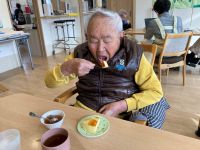 2月はプリンケーキでした。午後のレクリエーション中うとうとされていた入居者様も、「今日のおやつはプリンケーキですよ」と