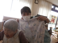 先日事務所にて男性職員さんが利用者様のパジャマのボタンがとれていたので付けられていました!