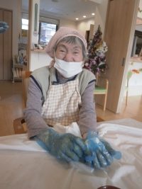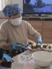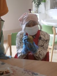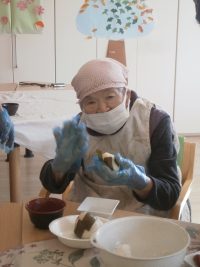 入居者様と一緒におむすびを作りました。海苔で巻いたり、ふりかけで味付けしたりとお好きなように作って頂きました。
