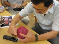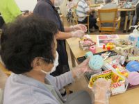 本日の手工芸は、「コットンボール」です。お好きな糸を選ばれて風船に巻き付けます。