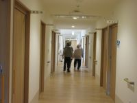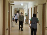 デイサービスからグループホームに続く長い廊下で歩行運動も頑張ります。