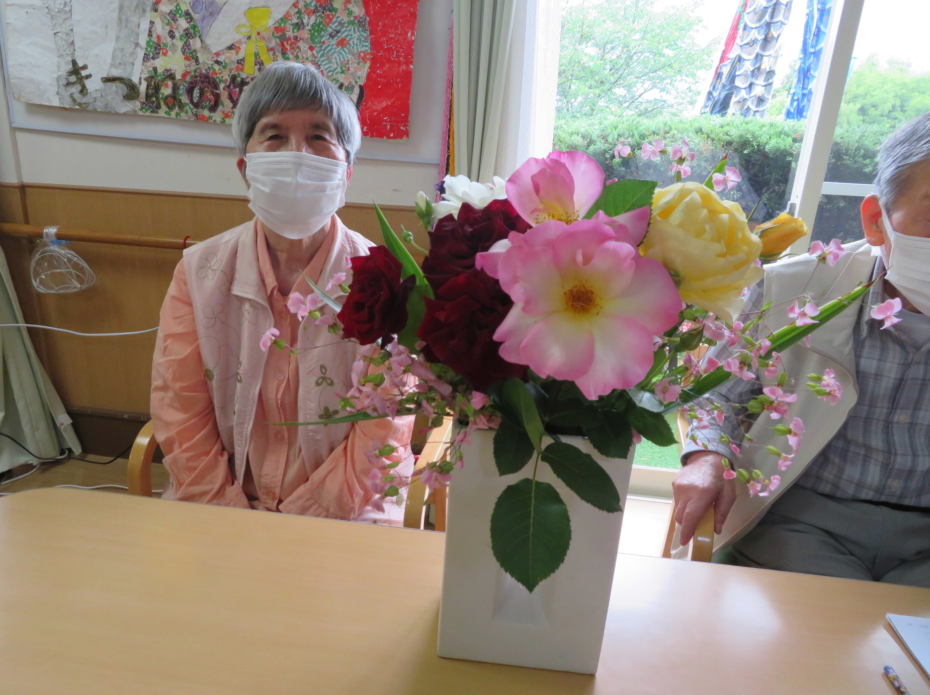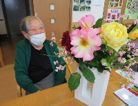 色とりどりのバラの花をテーブルに飾ると「わあ!」と歓声があがり、「この花がいいね」「こっちもかわいいよ」と利用者様のお顔も輝いておられました。