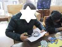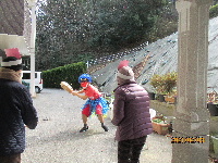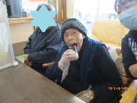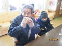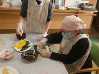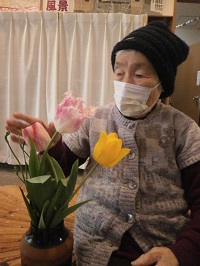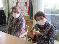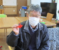 鬼に一生懸命豆を投げる御入居者様と静かに見守る御入居者様と