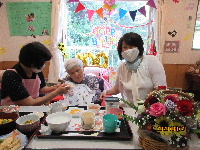 誕生会では、コロナの感染症対策をしっかりとったうえで、スタッフやご入居者様と一緒にお祝いさせていただきました。
