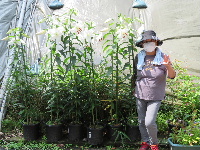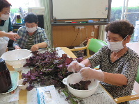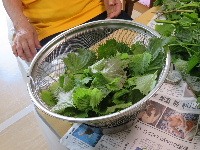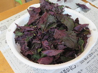 畑に生えた大葉と、赤しそを丁寧にちぎり