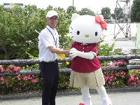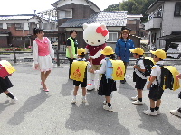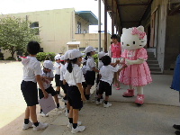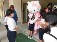 また、お昼休みと立哨の時間にも「キティちゃん」が登場!!驚いたのもつかの間、あっという間に子供達に囲まれてしまいましたが、スタッフの声掛けで子供達は一列に並び、一人づつ握手やハグをするなど、礼儀正しく交流することができました。立哨でも、一人づつハイタッチやハグをするなど、子供達にとっても心に残る出来事になったのではないでしょうか。