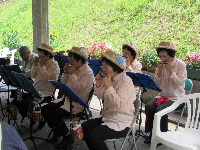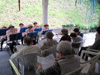 天気も良いので、玄関前のスペースを利用し「青空コンサート」にて実施とさせていただきましたが、懐かしい唱歌や童謡、歌謡曲などハーモニカの演奏に合わせて、皆様の歌声が響いていました。司会の方のお話も楽しく、笑顔あふれる時間となりました。