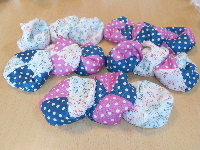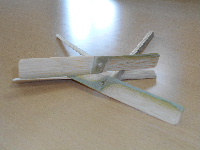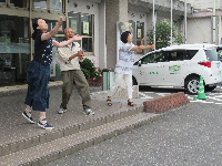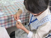 また、手工芸の時間には「昔遊び」をテーマに、女性はお手玉作りを、男性は竹トンボ作りを行いました。女性はお手玉ができあがったところで時間となってしましましたが、男性は公民館の玄関にて竹トンボ大会を実施することもできました。