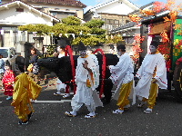 このお祭りは、江戸時代、寺の住職が夢枕に現れた白狐の夫婦に頼まれて供養したところ、失くしていた数珠が見つかったという伝説にちなみ、1950年から始まった行事です。新郎新婦役は地元の独身男女が務めますが、狐のお面を被っており身元は公開しないのが習わしで、新婦役は良縁に恵まれるとされています。地域の方や子供会などのお神輿も交えながら、旧花岡街道を練り歩く行列ですが、終点の花岡駅前では餅まきもあり皆様から愛されるお祭りです。