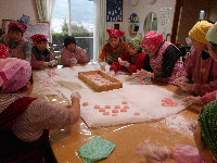 今年は、通常の”杵つき”と、珍しい”台唐(だいから)”という道具を使用してお餅をつきました。写真のような道具なのですが、足を使いながら餅をつくという行程を皆様にも交代で体験いただき大変好評でした。このように餅をつくのは男性のご利用者様やご家族様にお願いし、フロアの中では女性のご利用者様・ご家族様がつきたてのお餅を手際よく丸めてくださいます。また、今年は変わり餅として”みかんもち”(みかんを一緒につきました)を作ってみました。ほんのり甘酸っぱいやさしい味のお餅でしたよ。
