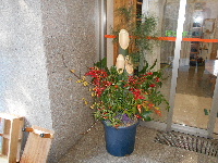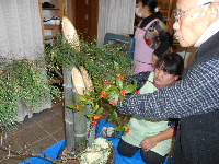 そして、玄関に飾る門松も手作りいたしました。裏山にある松や竹、梅を頂いてご利用者様とご一緒に飾りつけをいたしました。バランスが難しく少し苦労いたしましたが、こちらも素敵な門松ができましたよ。