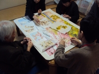 出来栄えはいかがでしょうか?やさしい先生のご指導の下、女性のご利用者様が中心に取り組まれますが、時には男性のご利用者様もご参加くださいます。「これはここでいいかね?」「この花はどこにしようか?」など、皆様楽しく取り組まれていらっしゃいますよ。