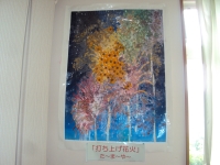 奇数月はグループホーム、偶数月はデイサービスとご指導いただくのですが、デイサービスでは、大きな模造紙に季節の風景等を下書きし、その上に先生がご用意くださった色とりどりのお花を貼り付けてまいります。今回添付させていただいた写真は、春と夏の作品です。春の作品は、桜をメインに小川の流れる風景を描いてみました。また夏の作品は、レースフラワーやひまわり、カスミソウなどを散りばめて大きな花火を描いてみました。