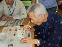 午後からの1時間程をボランティアの先生方とご一緒に、季節の花や野菜・果物などを題材にしてハガキに描いてまいります。皆様それぞれに筆を走らせ色も付けてくださいますが、片隅に添える一言がいつも楽しみです。難しそうにされておられる方には、先生がそっと手を添えてくださいます。今回は、おいしそうなさくらんぼや紫たまねぎ、きれいなアジサイが描かれていましたよ。「子供の頃食べたさくらんぼ。おいしかった」「食べたい」(さくらんぼの絵)「涙の数だけ元気になる」(紫玉ねぎの絵)「花が大好き」(あじさいの絵)など・・・