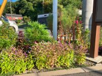 表札の周りの小さな庭に季節ごとの花を植えています。