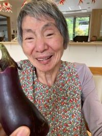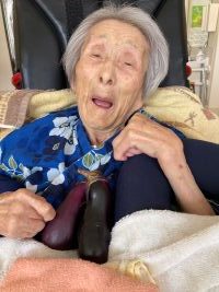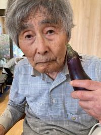 大きなかぼちゃとツルツルピカピカのナスがはぴねデイサービスの畑でとれました。収穫されたかぼちゃやなすをご覧になられて「お~😊お!どうかこりゃ!すごいのぅ」とおどろかれるF様。ニコニコのH様。