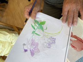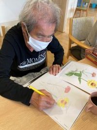 明日から9月だというのに外があまりにも暑いので、室内で秋のお花の塗り絵をしていただきました。