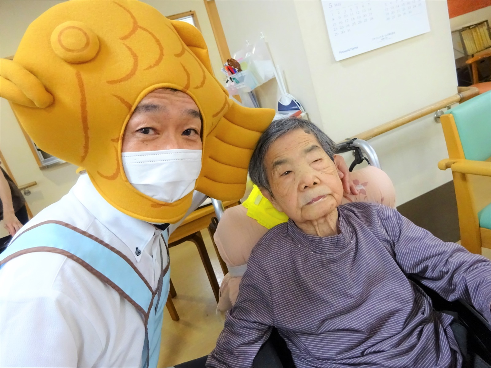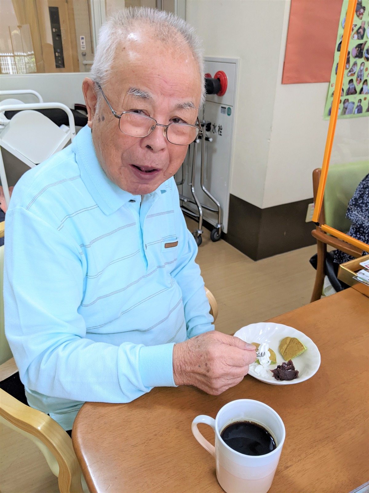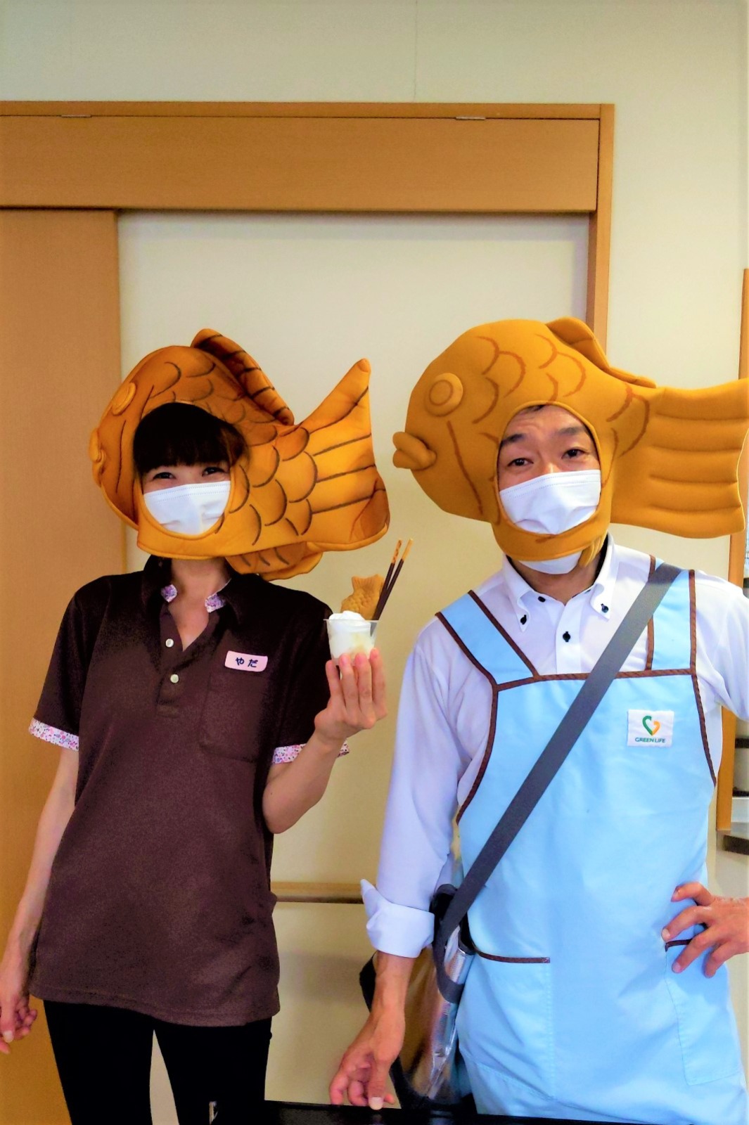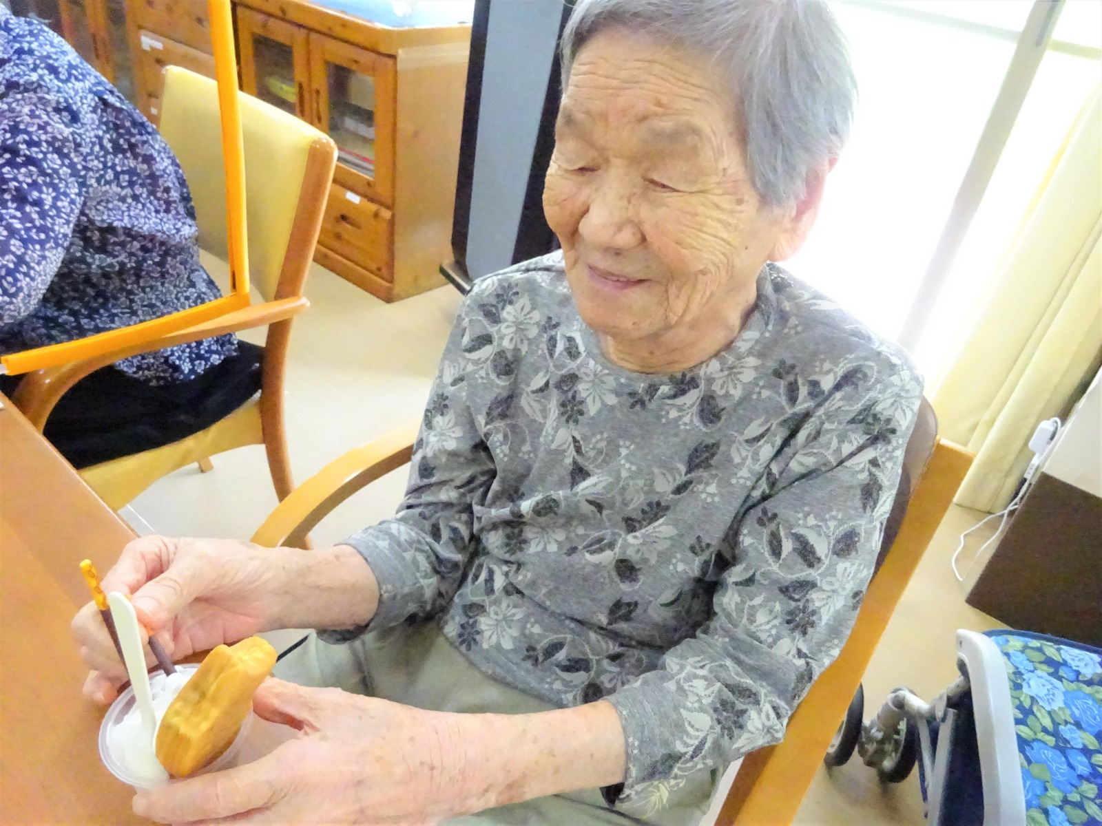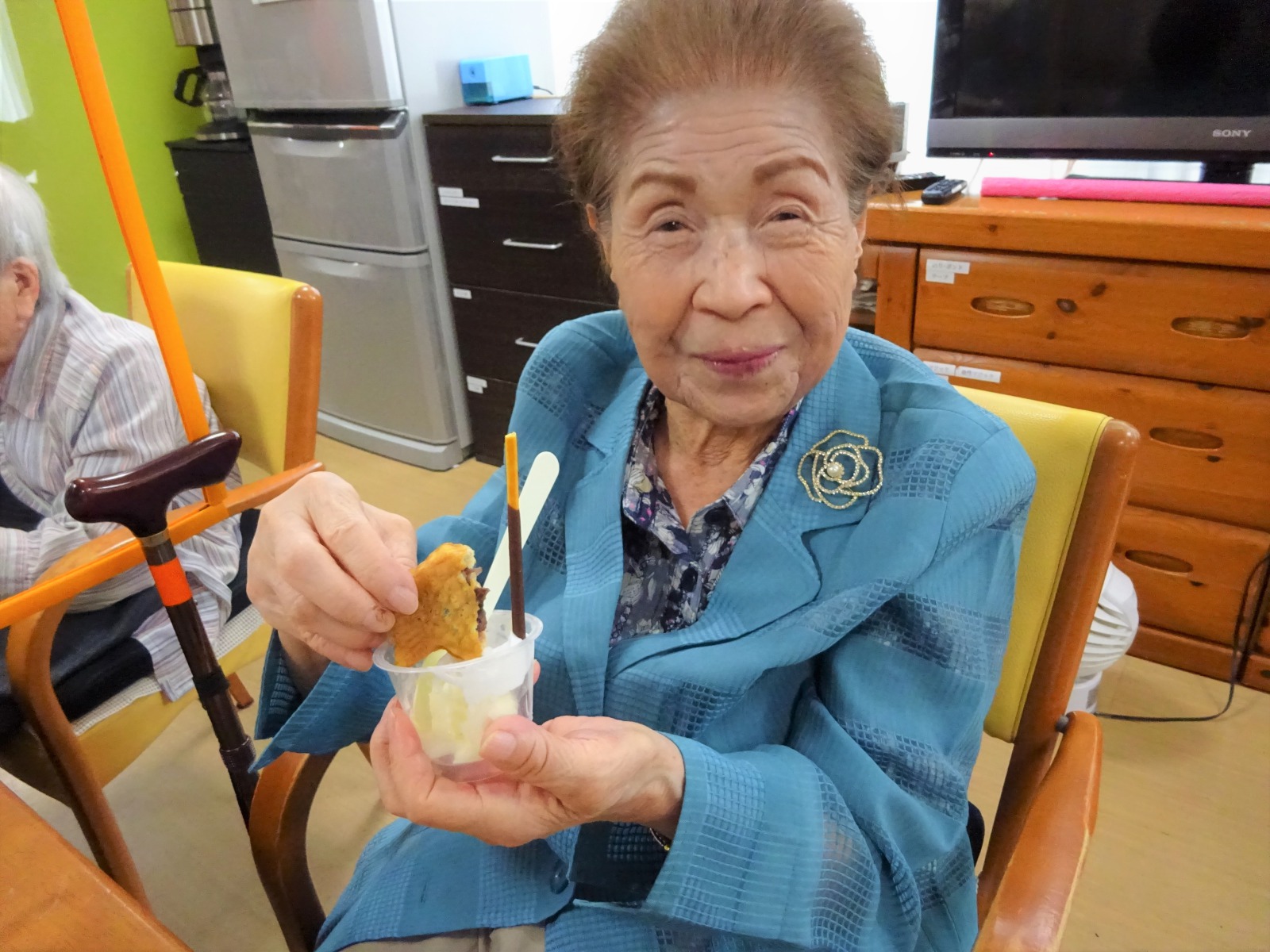 本日のおやつは「たい焼き」でしたが、暑い日となったのでアイスクリームの上にのせてしまいました!「あら〜、たい焼きの頭が埋まってるわぁ」と。「でも、美味しい〜」ととても喜んでいただきました(⌒∇⌒)