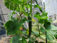 「見てみ、ちっちゃなきゅうりがあるわ」