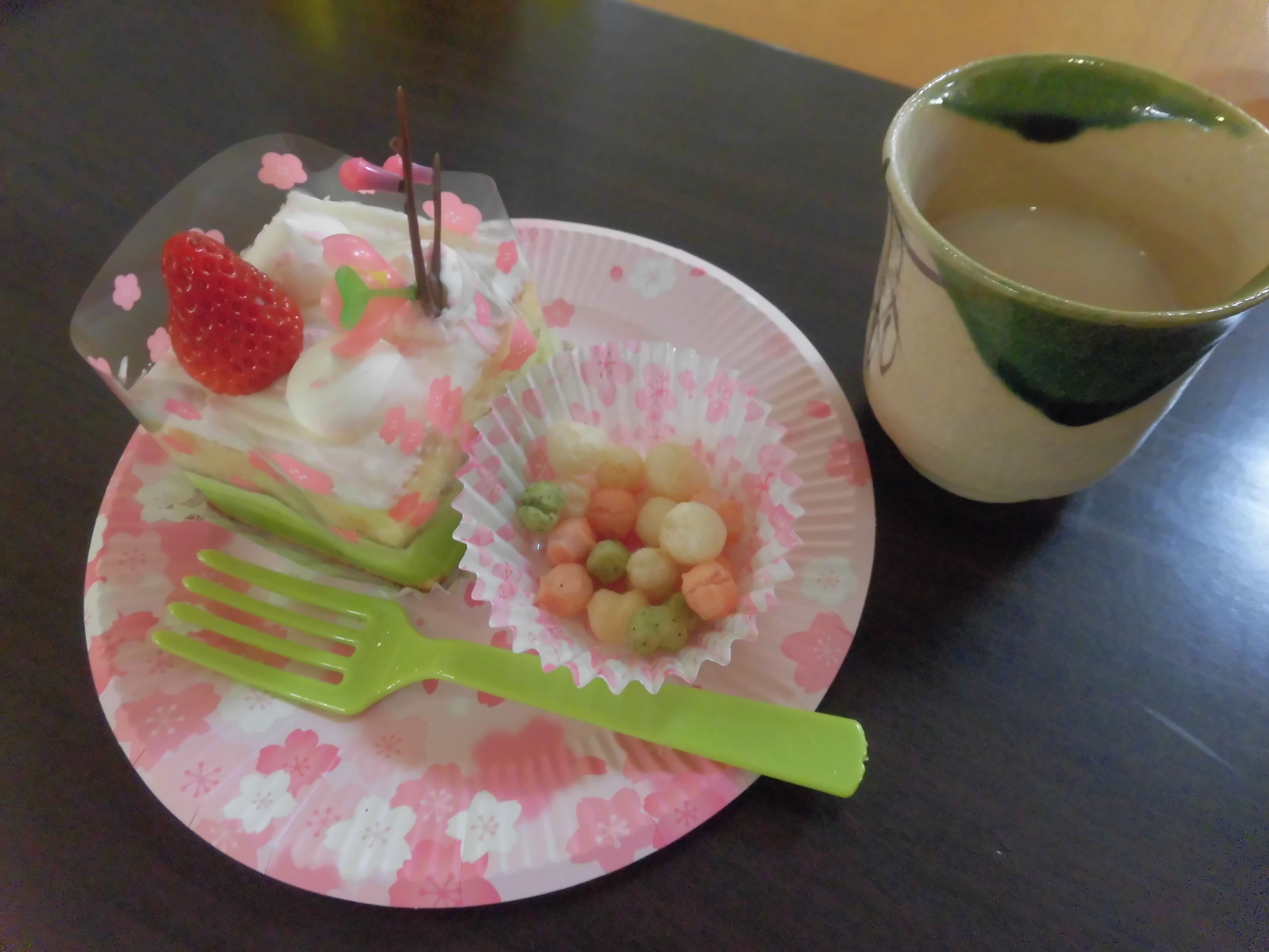 皆さんに美味しいケーキと甘酒をお配りしました。