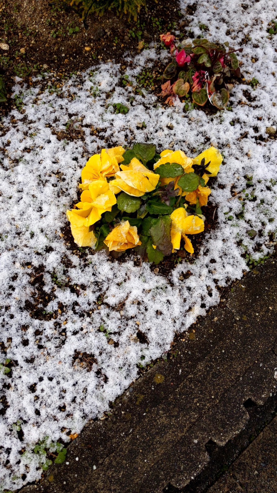 花壇にうっすらと雪が積もり、咲きだしていた