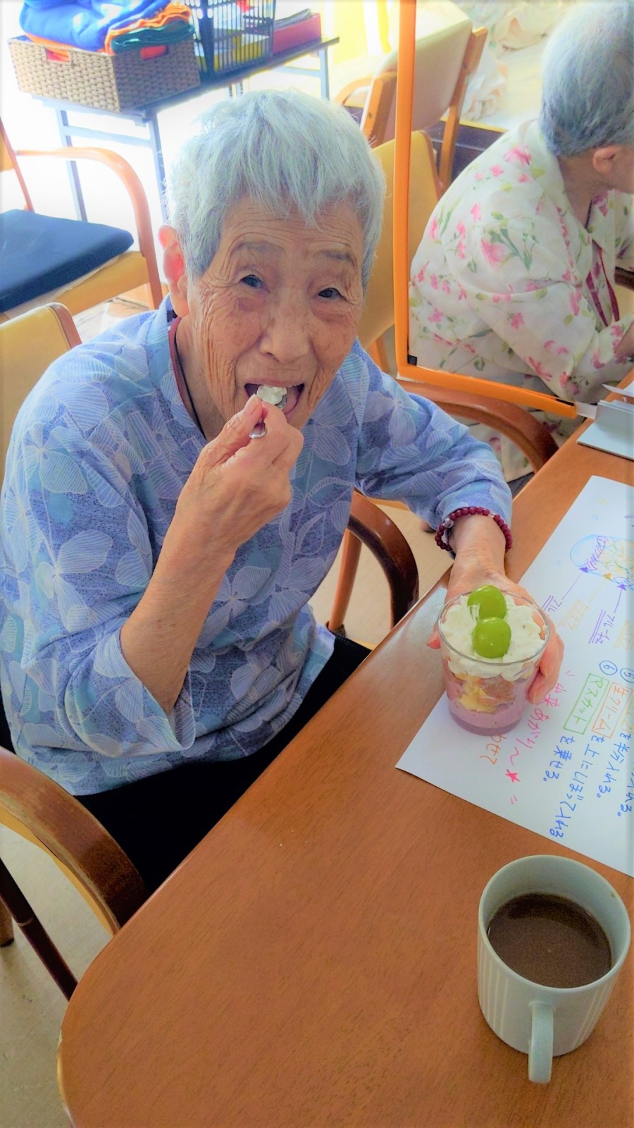本日のデイサービスのおやつは手作りパフェでした!自分で器にババロア、ホイップクリーム、仕上げにシャインマスカットをのせました。どうですか?美味しそうにできてますね(⌒∇⌒)