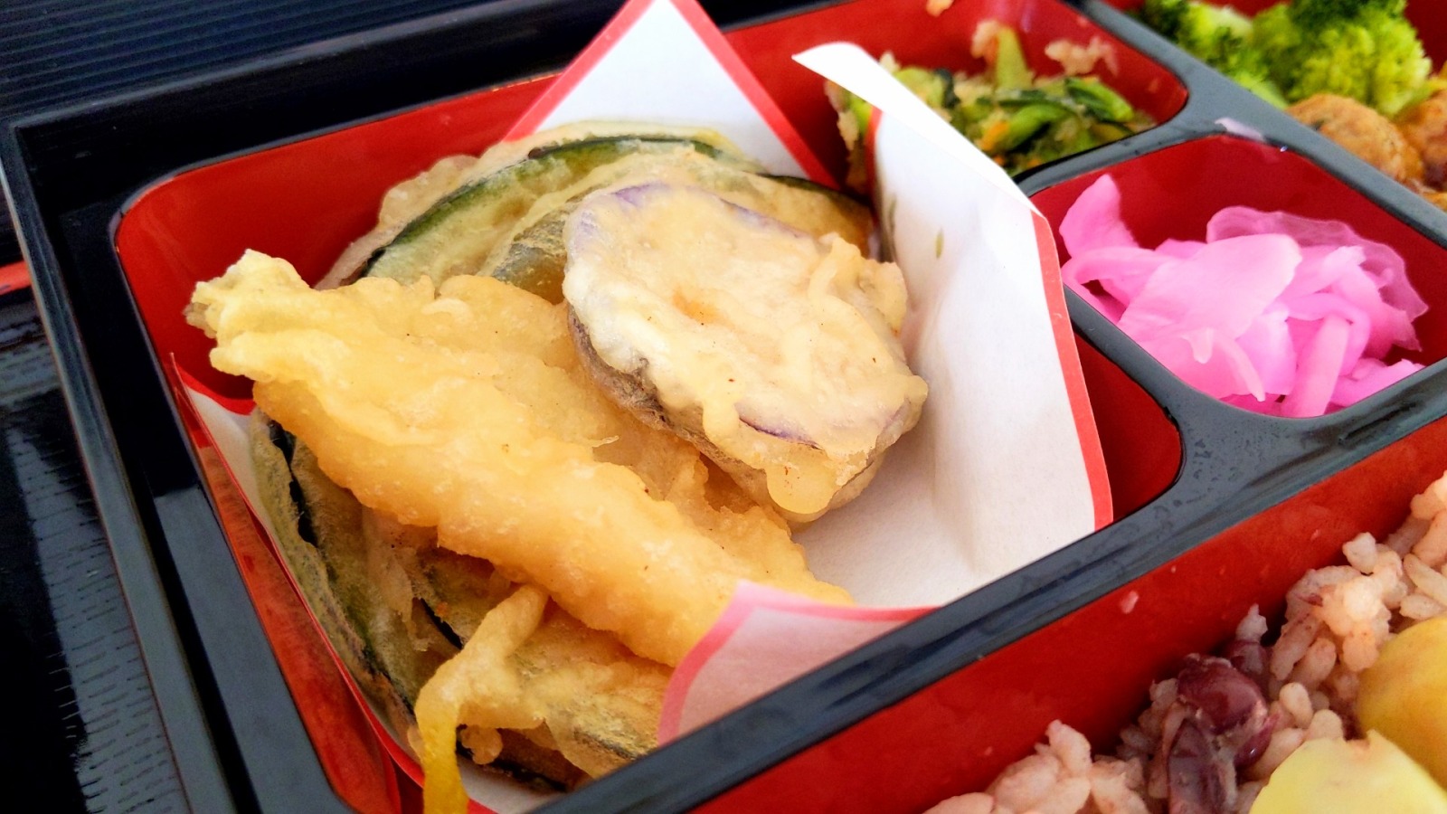 ㊗敬老の日!昼食は松花堂弁当をご用意しました。皆様のお好きな赤飯(栗)、天ぷら、茶わん蒸しでお祝いしました(⌒∇⌒)