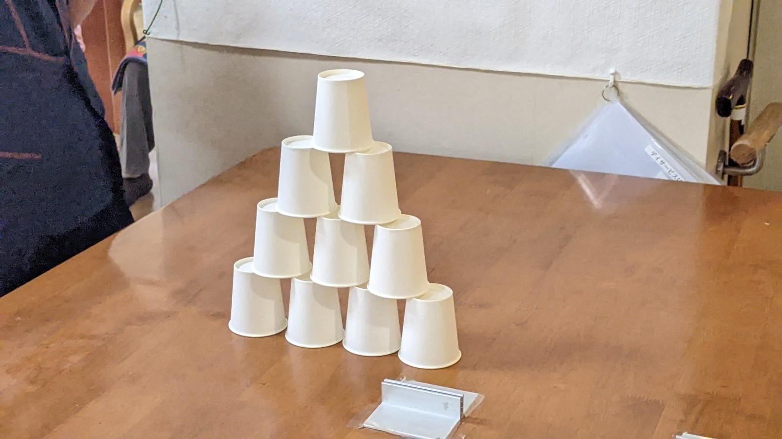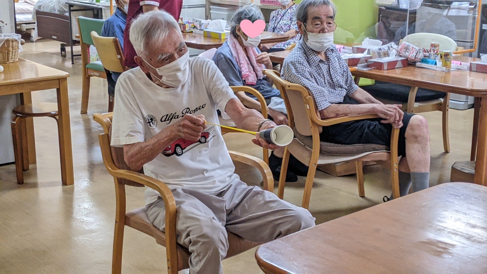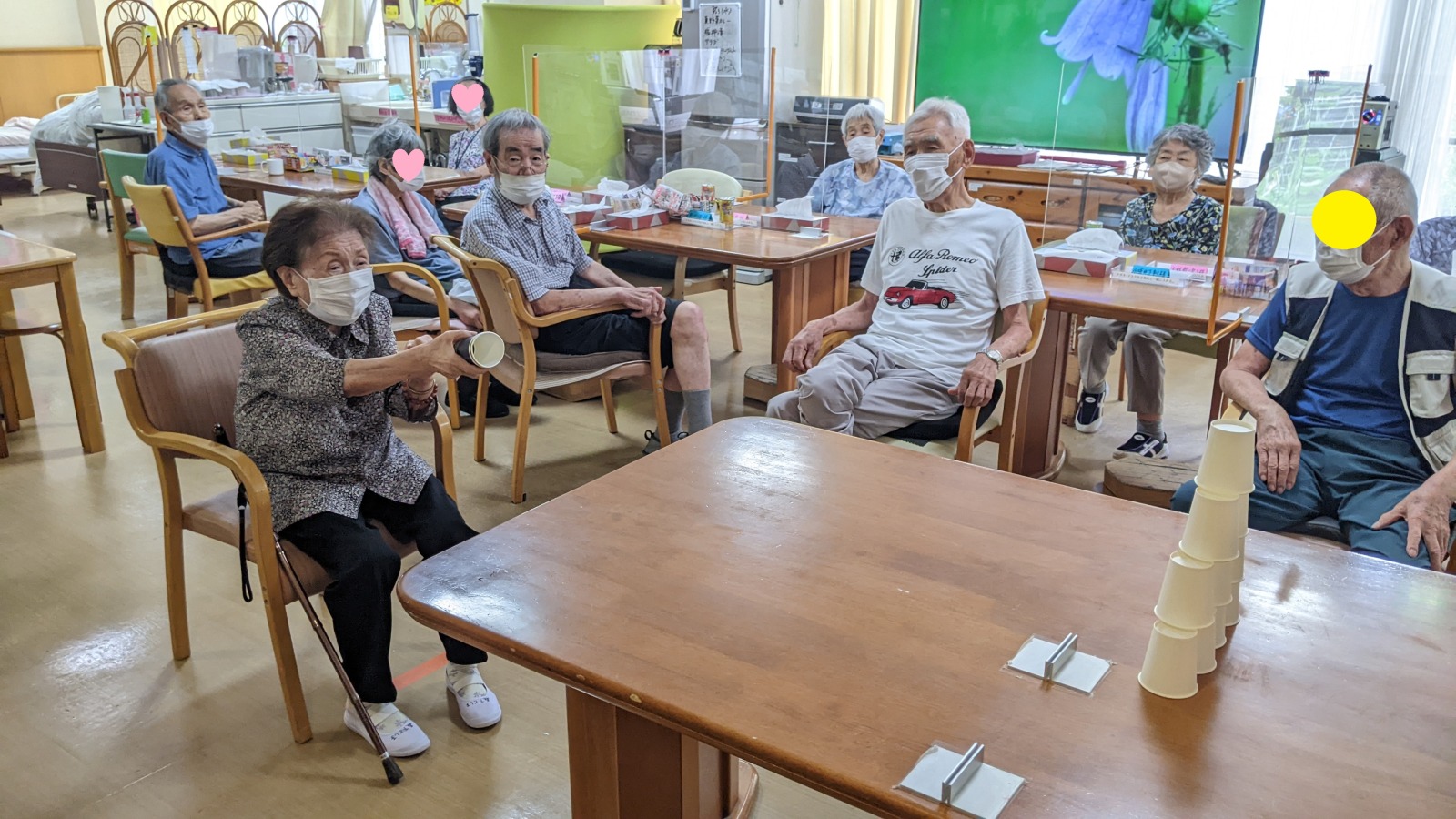 デイサービスでは夏祭り週間として、景品付きゲームを行っています。今回は紙コップ崩しゲーム。ピンポン玉を飛ばして紙コップのタワーをいくつ崩せるかを競いあいました!これが結構むずかしかったです(⌒∇⌒)