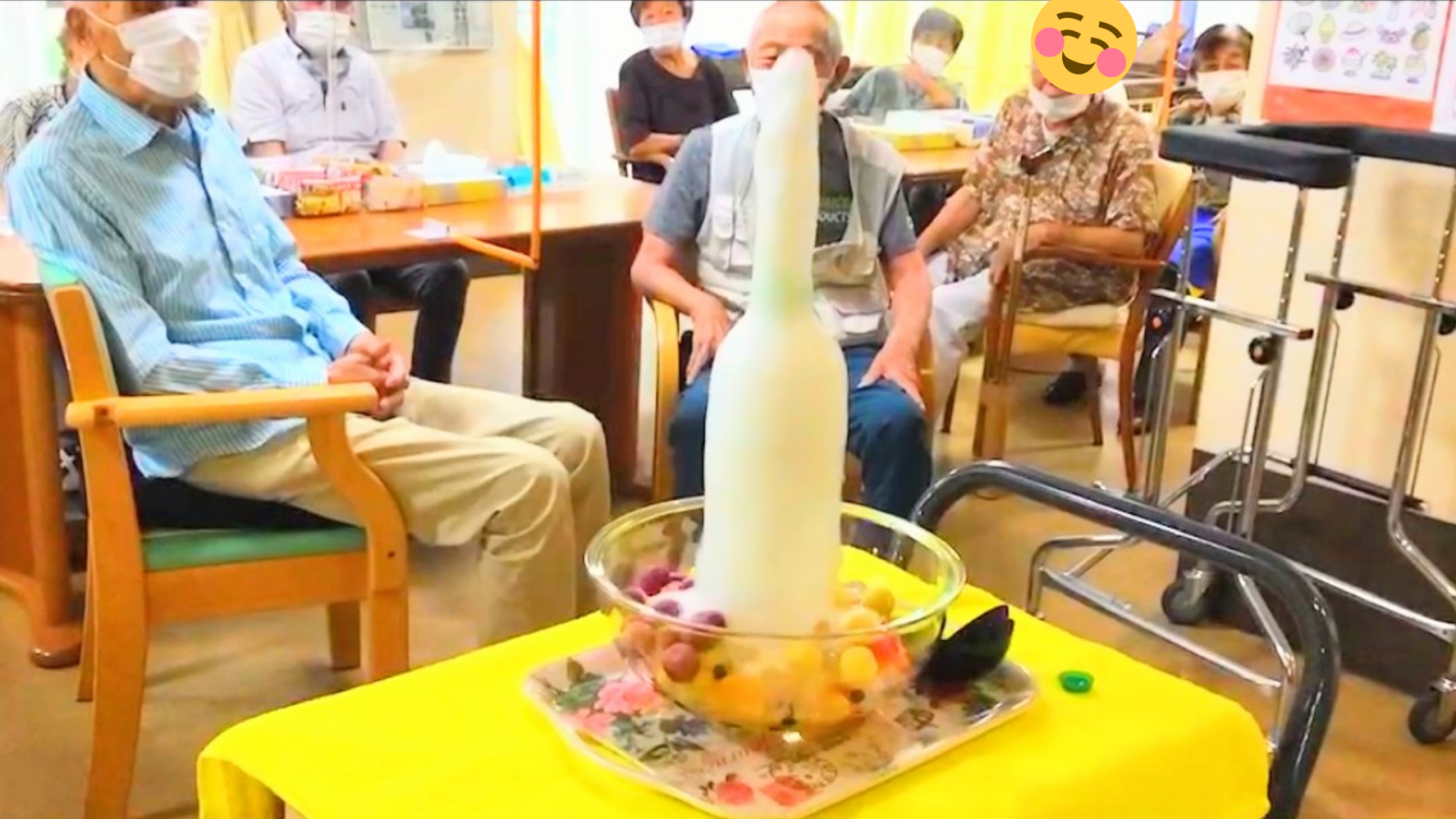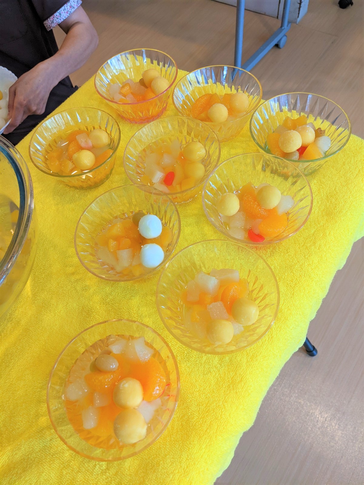 ボウルにフルーツを敷き詰め、その中央に立てたサイダーボトルにラムネを投入するとシュワワワワーッ!と「噴水フルーツポンチ」の出来上がり。皆さん楽しんでいただきました(⌒∇⌒)