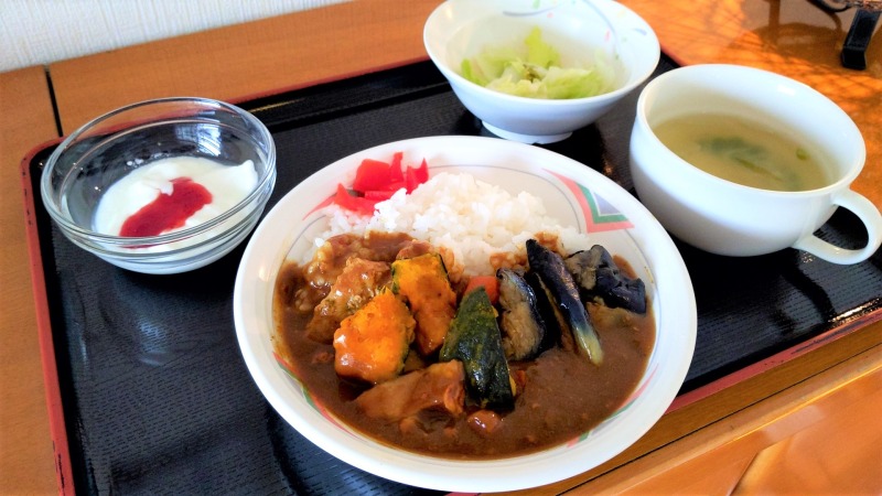 本日のランチは「夏野菜カレー」でした。ナスとかぼちゃがごろごろとのっていました(⌒∇⌒)