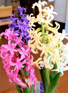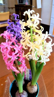 ご家族様が持ってきてくださったヒヤシンスの球根がみごとに花を咲かせました!とてもきれいな3色の花が咲いています(⌒∇⌒)