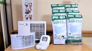 はぴね弥富では共用部はもちろん、ご希望いただいたご入居者様の居室にも低濃度オゾン発生装置「エアネス」を設置しています。また、職員は医療現場でも使われている「SHIPマスク」を使用しています。いずれも施設でご購入いただけます(⌒∇⌒)