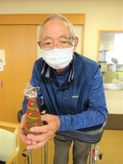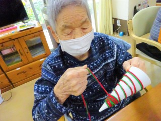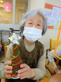 デイサービスでクリスマスツリーを作成しました。皆さん、一足早くクリスマスの準備を楽しまてしました(⌒∇⌒)