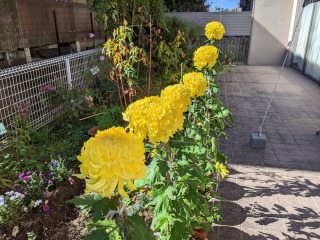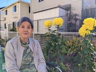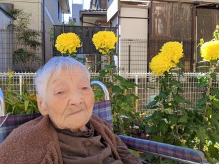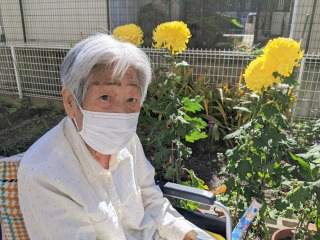 暖かないいお天気なので、ご入居者様をお庭にお連れしました。男性職員が持ってきてくれた菊の花がきれいに咲いていたのを見て、皆さん癒されていたようです。(⌒∇⌒)