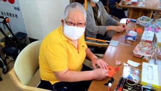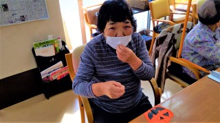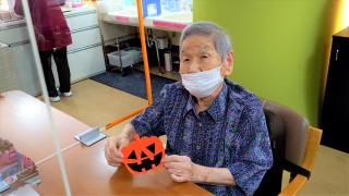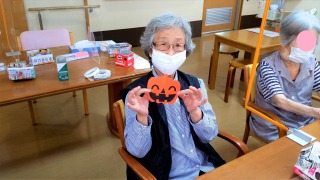 ハロウィンに向けての飾り作りをお願いしました。おばけカボチャとはいえ、皆さん目の位置や口の位置、それぞれ拘りがあるようで、何度も貼りなおしている方もいました(⌒∇⌒)