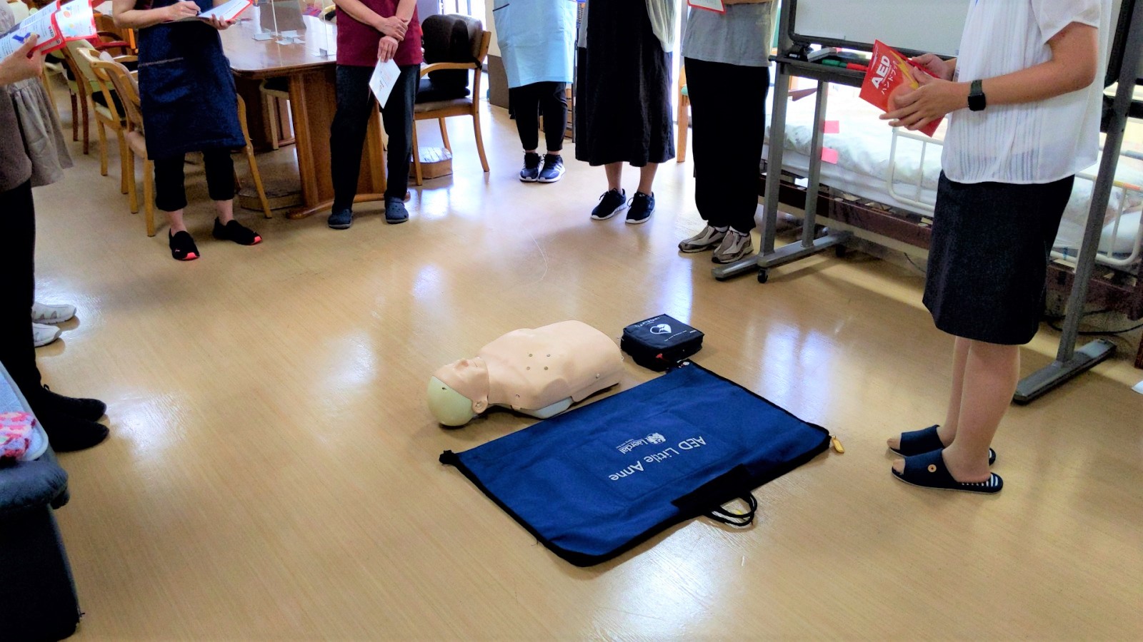ご入居者様・ご利用者様、また近隣にお住まいの方や周辺をご通行の方々が万が一の事態に備え、AED(自動体外式除細動器)を設置いたしました。それに伴い、心肺蘇生とAEDの使用について講習も行っています。これからも迅速かつ適切な救命処置を行えるよう心掛けてまいります!