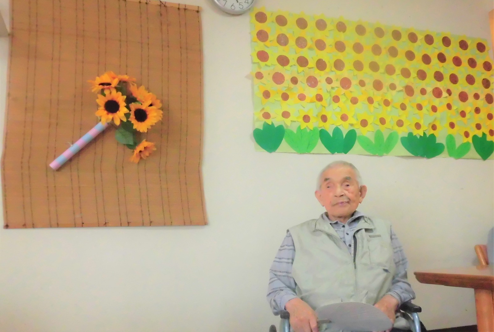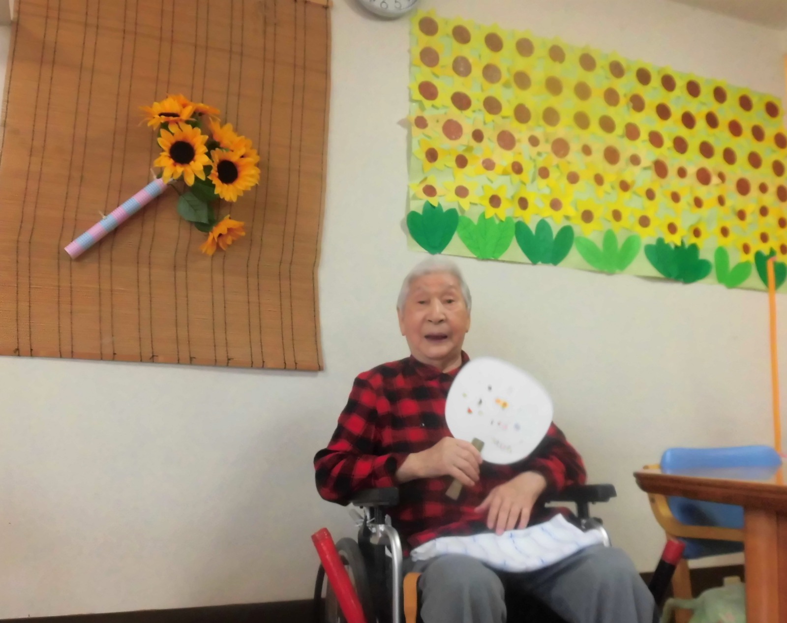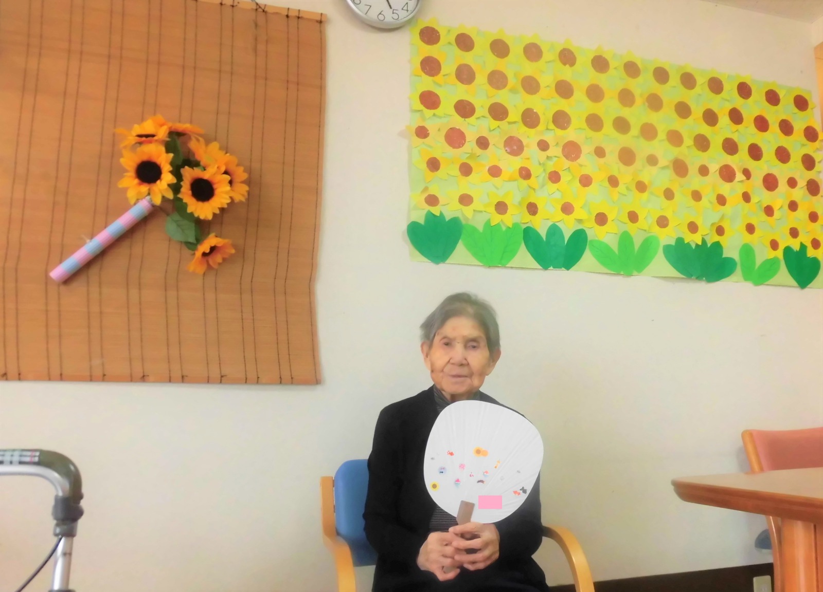 団扇を手に、ひまわり🌻の前で「はい、チーズ」と記念撮影をしました(⌒∇⌒)