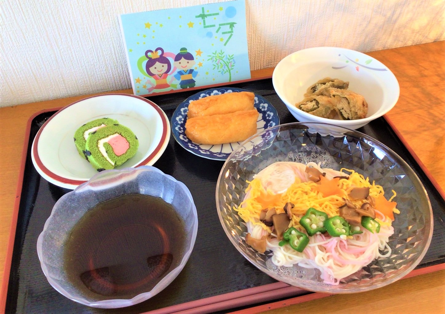 ランチは七夕そうめん、おやつは厨房さんが餡から手作りしてくれた「ずんだどら焼き」と天の川をイメージした「七夕サイダー」をご用意しました✨皆さん、「願が叶いそう!」と喜んでいただきました(⌒∇⌒)