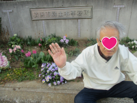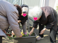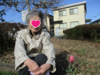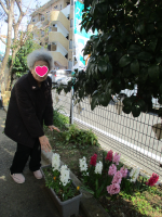 施設の庭にみんなで植えて、丹精込めて育てているヒヤシンスやチューリップが咲きました。