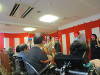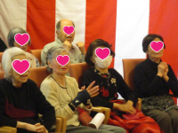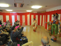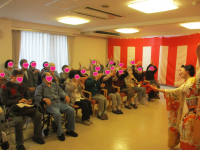 いきなりの女形での入場。参加者の皆様からは「えっ?女性?」の表情が窺えていましたが、その妖艶さに引き込まれていました。続いては侍に扮した右近様。女性入居者様の目が♡♡になっているんです。普段の生活では見られない表情。なんとも言えない素敵な乙女の表情でご覧になっていました♪(笑)