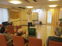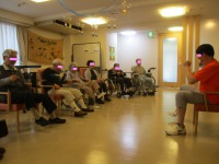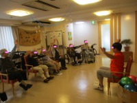 元気があり盛り上げ上手な体操のお兄さんに誘われ、ついつい体が動き、自然と声も出てしまう大好評のレクリエーション、ボール体操なんです。